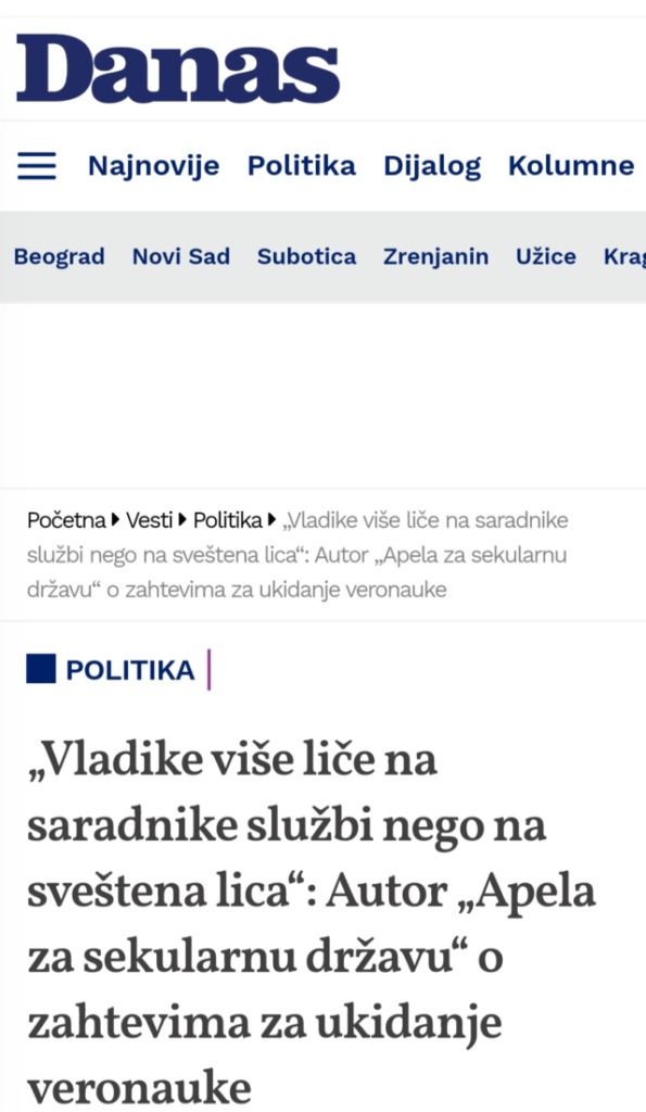 У Вашем излагању јако мало сте и причали о веронауци. Све време сте наводили Патријарха, ордење и мешање СПЦ у политику. Тиме долазимо до тога да је јасно који Вам је циљ. Онај говор Патријарха о породичним вредностима неке је потресао и уздрмао па су се многе невладине организације које подржавају еуро прајд огласиле и уротиле на једну чисту ствар као што је верска настава. Попут Вас.