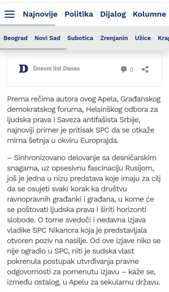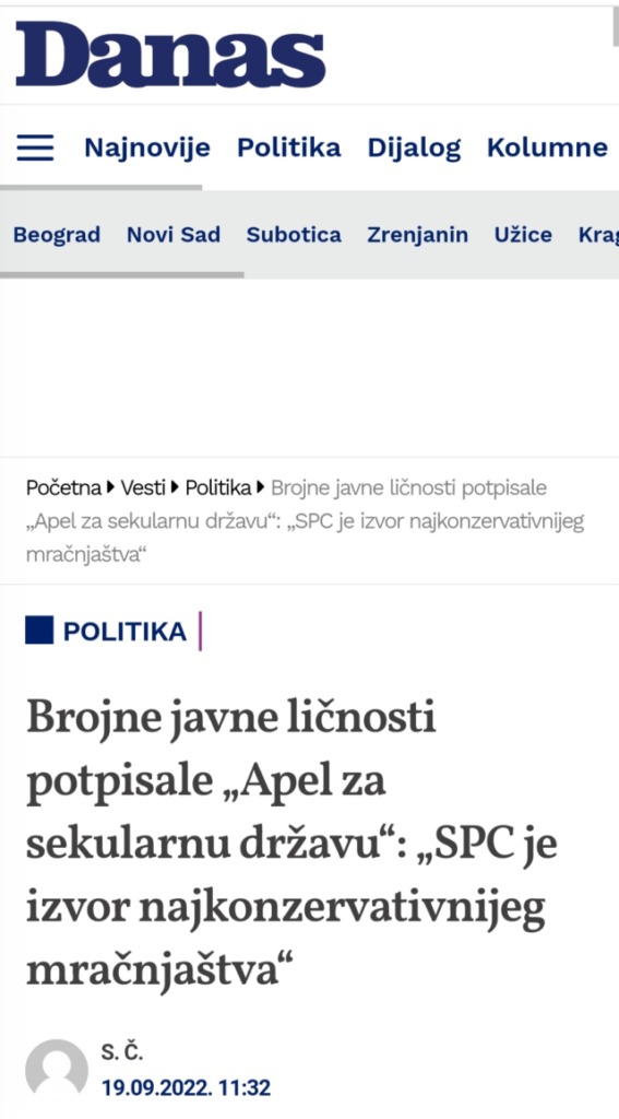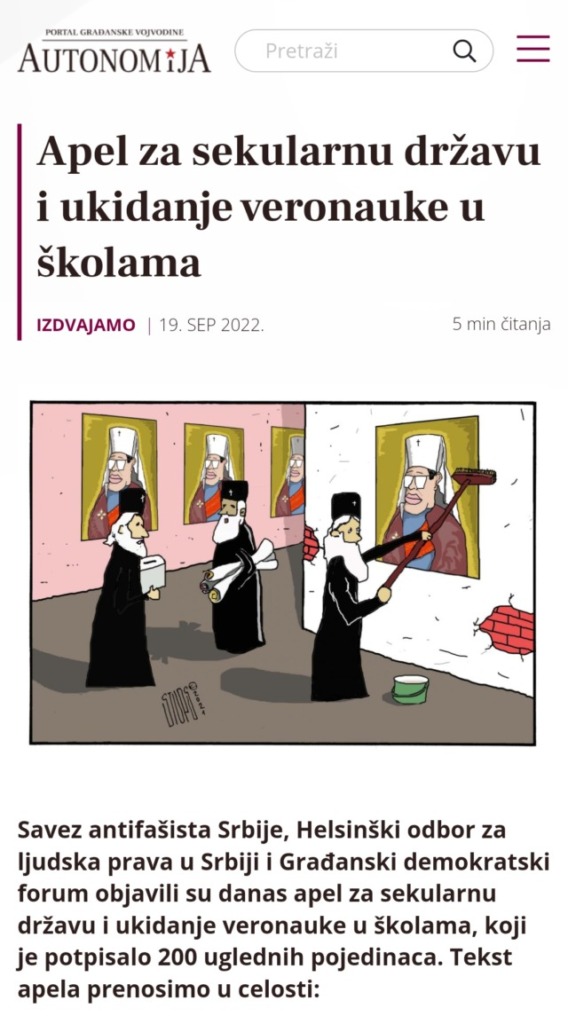 Ово Вам кажем у своје лично име и као родитељ троје деце школараца који похађају часове веронауке а и као пуноправни грађанин ове наше заједничке Србије! Ако сте заиста добронамерни у жељи да учините нашу земљу бољом за живот наше деце онда нам помозите у томе, а не по интернету да скупљате петиције, јер у супротном, ако ја почнем да скупљам петиције по интернету за рецимо укидање мостова у Финској, јер људи треба да пливају и да је то добро за њихово здравље, онда ће остати без мостова јер могу скупити врло лако пар стотина хиљада потписа и изузетно битних личности ако је то начин!  Јер, видите, СПЦ је мост и то духовни који је подједнако важан за очување нашег народа који Ви упорно, не бирајући речи, покушавате да срушите и поделите и дестабилизујете нашу земљу и народ који ту живи!
